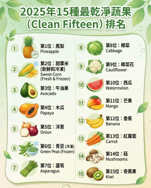 2025年15種最乾淨蔬果(Clean Fifteen)排名