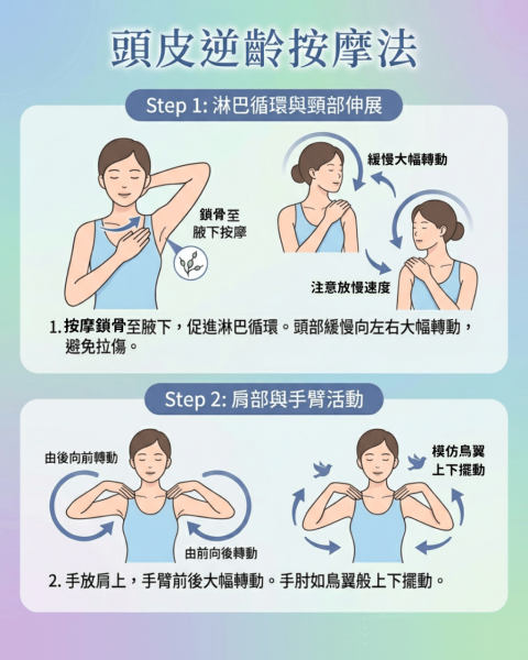 因此,要改善頭皮健康,關鍵在於促進血液循環。最重要的一步是必須由頭部周圍的大肌肉群開始放鬆。本山典子強調,直接按摩頭皮效果有限,正確的做法是先由頸部及肩膊周圍開始,每個步驟建議重複5-10次。由下而上暢通血液循環,使營養能夠源源送達頭皮。
