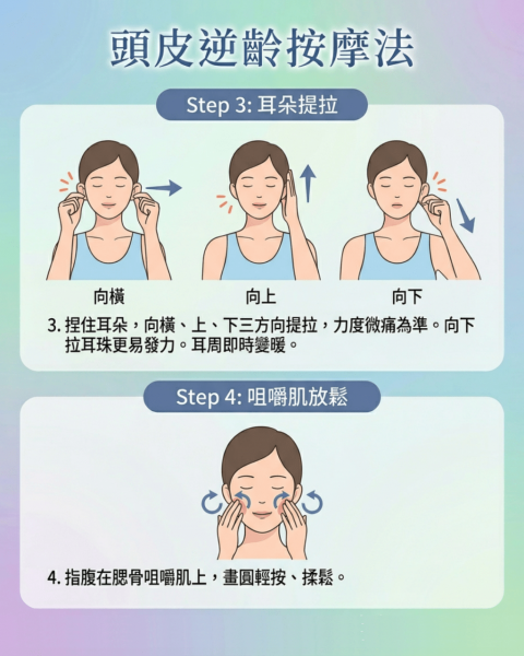 - 將食指至尾指的四隻手指,放在耳上方的側面頭皮,以輕柔的力度上下搖動、按摩。手指位置由下而上,逐少移動,一直按摩至頭頂。