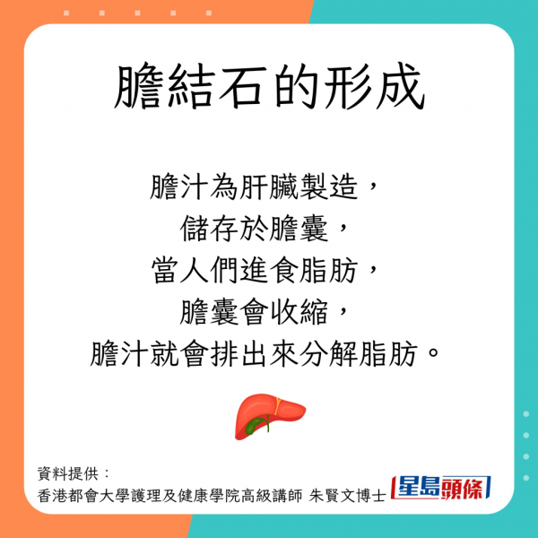 - 其他誘因:患有糖尿病、高血脂、肝硬化等長期病患,會影響膽汁代謝;部分藥物、或女性荷爾蒙失調亦可能干擾膽囊功能;有家族病史、以及40歲以上的女性,均屬於較高風險的群組。