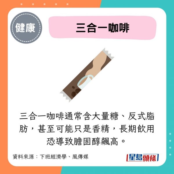 - 三合一咖啡通常含大量糖、反式脂肪,甚至可能只是香精,長期飲用恐導致膽固醇飆高。