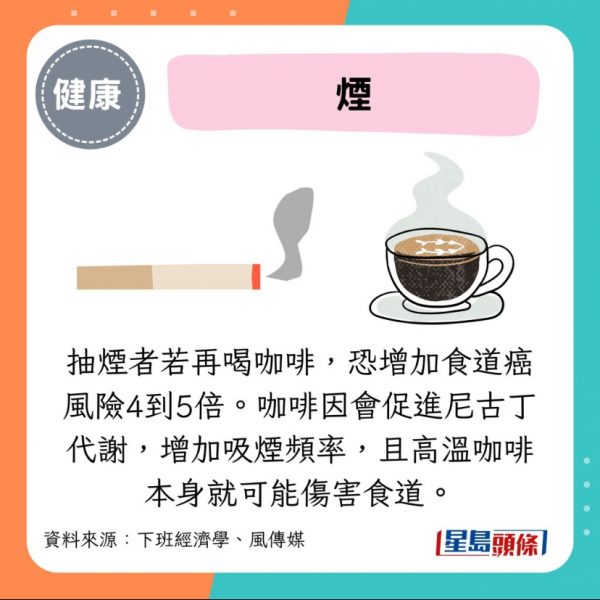 - 抽煙者若再喝咖啡,恐增加食道癌風險4到5倍。咖啡因會促進尼古丁代謝,增加吸煙頻率,高溫咖啡本身就可能傷害食道。