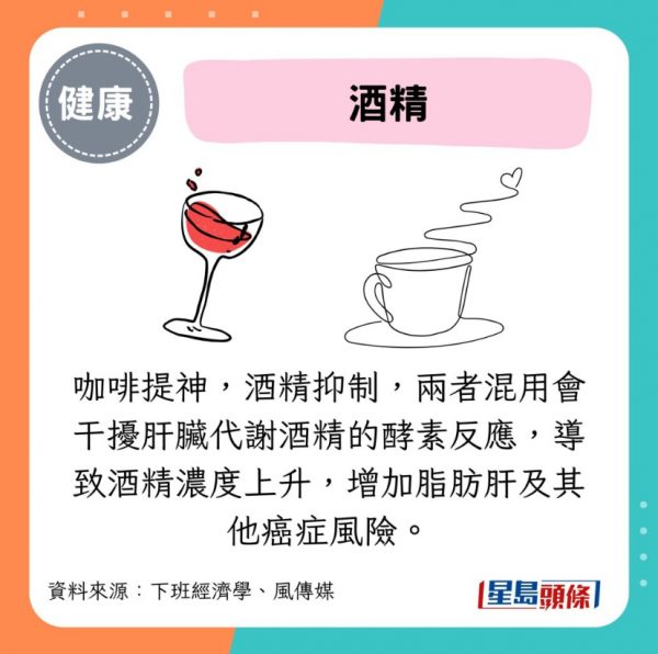 - 咖啡提神,酒精抑制,兩者混用會干擾肝臟代謝酒精的酵素反應,導致酒精濃度上升,增加脂肪肝及其他癌症風險。