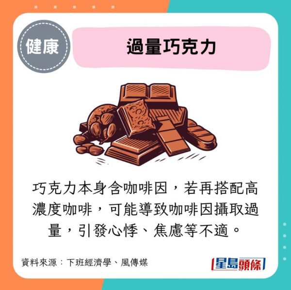 - 巧克力本身含咖啡因,若再搭配高濃度咖啡,可能導致咖啡因攝取過量,引發心悸、焦慮等不適。