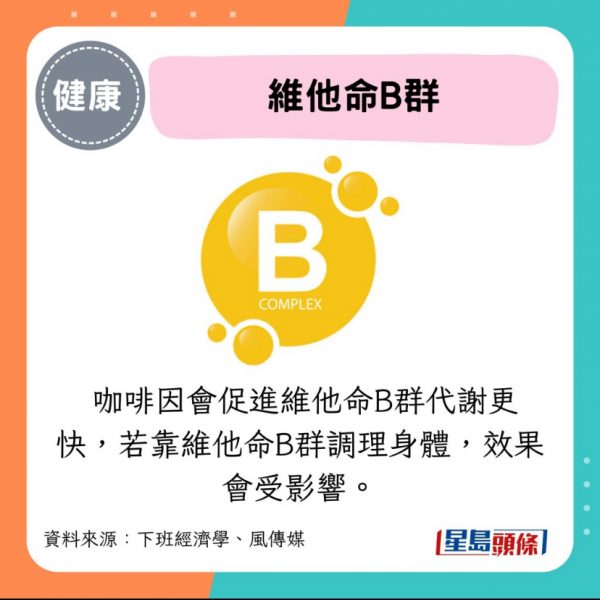 - 維他命B群: 咖啡因會促進維他命B群代謝更快,若靠維他命B群調理身體,效果會受影響。