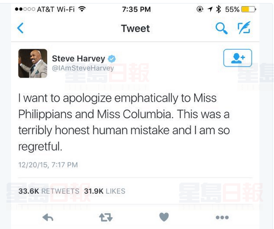 不過這還沒完。Harvey在推特上發佈道歉信息時,把菲律賓和哥倫比亞都拼錯了。他寫成了“Miss Philippians and Miss Columbia”,正確的是philippines和Colombia!