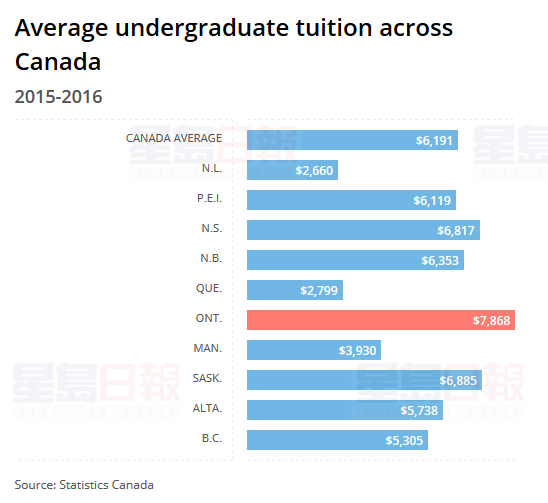 安省平均本科生學費為 $7,868,而加拿大本科生平均學費為 $6,191。