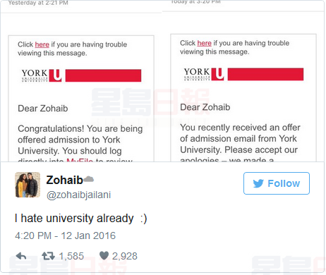 一名報考了約克大學的學生Zohaib Jailani收到大學的錄取email,但過了一天后,又收到大學的道歉email,稱系統出了問題,這封email原本應該是感謝他們報考約克的問候信,而不是錄取通知信。