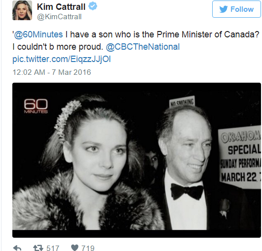曾出演“Sex and the City”的女演員Cattrall在推特上開玩笑說,“我有一個當加拿大總理的兒子?我太驕傲了。”