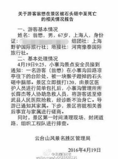 據鳳凰網報道, 21日下午,一則網貼在網絡傳播,稱遊客(翁懋,冠生園集團董事長)在雲台山風景區被猴子蹬下的石頭砸中,不治身亡。下午4點到5點,對於河南商報記者的多次核實請求,修武縣委宣傳部新聞科及雲台山風景區均無回應。而修武縣人民醫院急診科,當班醫生稱,確查有出診記錄,但因換班不了解病人病情。河南商報將持續關注。 (河南商報首席記者 王杰)