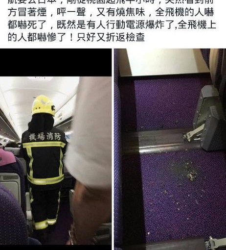 據巴士的報報道,一架由台灣台北飛往日本東京的民航客機,前晚在空中發生火警需要折返,原因是一位旅客隨身攜帶的手機充電寶(俗稱「尿袋」)發生自燃,空服員需要用滅火器滅火。台灣民航局稱,初步認定發生自燃的是大陸知名品牌「小米」的「山寨」產品。