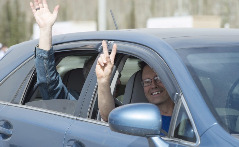 加通社圖-避難人士和鏡頭招手,表示已經安全逃離