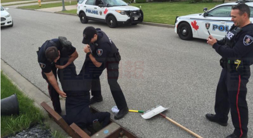 照片顯示,兩名警官抓著第三名警官的腿,把他倒著放入下水道口子,去救掉在下水道里的鴨子。