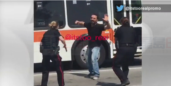 推特上發佈的一系列視頻顯示,這名男子在多輛停泊汽車和一輛巴士面前遭遇兩名女性警官。警官一直在叫他趴到地上,他起初照做了,但隨後就起來朝一名警官靠近,并咒罵她。