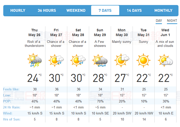 雨具隨身帶,今日入夜有機會下小雨,明晚到後天白天更有機會出現雷暴,但降雨量最大的將是未來這個週日,降雨量到達5mm,濕度也跟隨升高。