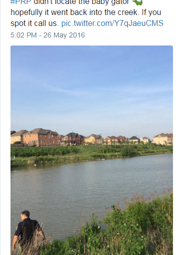 據CP24報道,皮爾區警說,昨晚分別有兩人打電話報警說,他們在Thorndale Road 交 Cottrelle Boulevard地區看見了短吻鱷(alligator)幼崽。警方搜索了該地區,但是未找到所說鱷魚幼崽。