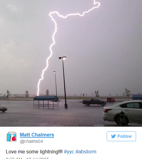 據CBC報道,週日上午,雷暴襲Calgary地區,帶來閃電,洪水和停電。加拿大環境部曾在上午六點半對Calgary發出雷暴警報,但已在九點四十分取消。但雷暴警告對Strathmore, Brooks, Vulcan, Airdrie, Crossfield, Cochrane, Olds, Sundre, Drumheller, 靠近Irricana和Beiseker的Three Hills和Rocky View縣仍然生效。亞省也緊急通知民眾在Chestermere有淹沒陸地的洪水。