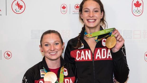 Penny Oleksiak(右)和 Rosie MacLennan(左)展示她們的金牌。(加通社圖片)