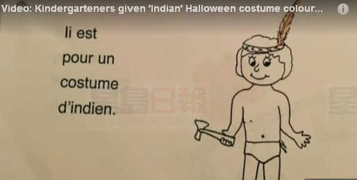 她的兒子在Pierre Elliott Trudeau Elementary School讀學前班(kindergarten)。他的老師給了他一個萬聖節字母塗色本。在字母“I”下面,是一名卡通的印第安人形象。下面的說明是“印第安人萬聖節化妝服”。