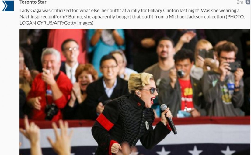 據星報:美國女歌星Lady Gaga週一晚在希拉里競選活動中出場助威,但是她的著裝卻引起了爭議,被批太像納粹制服。