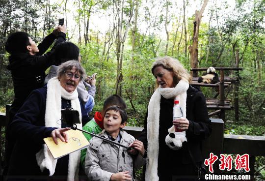 熊貓老粉絲和小粉絲們在成都大熊貓繁育研究基地合影留念。 安源 攝