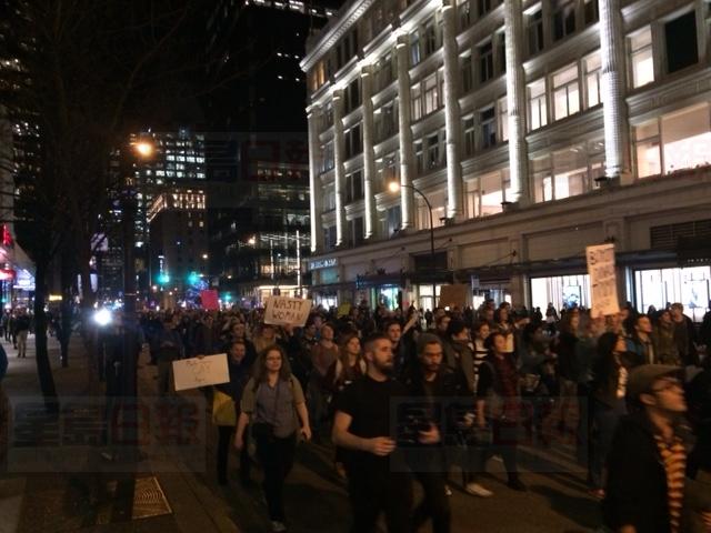 據英語電台CKNW報道,溫哥華市中心有大型集會活動,抗議特朗普當選美國總統,超過200人出席。