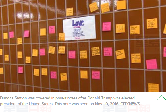 通勤者們在Dundas地鐵站用自粘便箋條留下他們的信息。這些信息留在一個標誌牌四周。這個標誌牌寫著“愛比仇恨強大”(’Love Trumps Hate ‘)。這個口號鼓勵人們繼續對彼此友善,一起使世界變得更美好,同時也一語雙關地指向特朗普對穆斯林發表的狹隘言論。