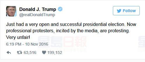 然後他又發表推特說,“現在,被媒體煽動的職業抗議者們在抗議。太不公平了!”
