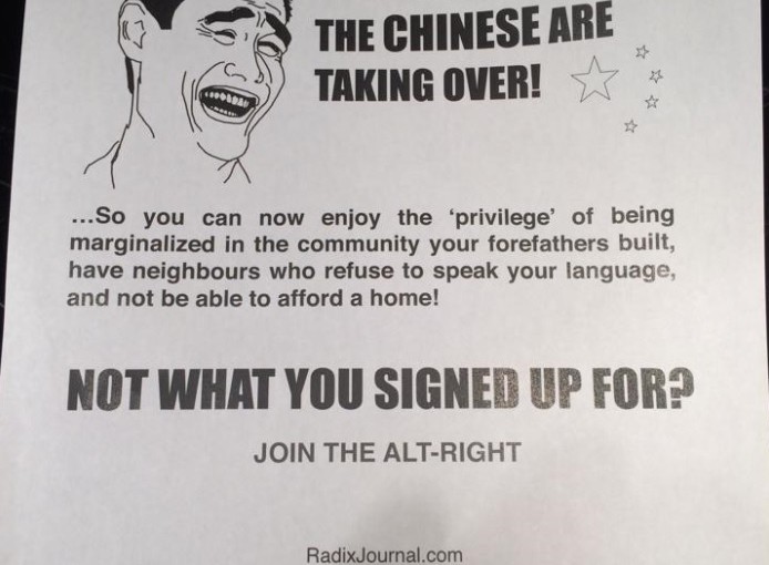 傳單指﹐華裔正接管該市﹐公眾應參與一個名為Alt-Right 的活動﹐作出對抗。有