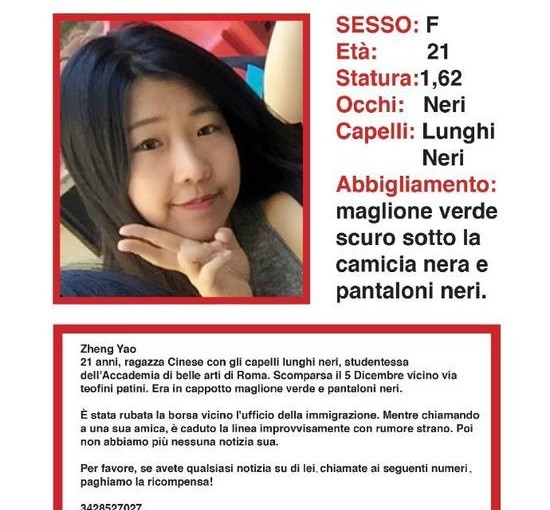 據法國《歐洲時報》意大利版報導,當地時間12月5日,意大利公投結束後的第一天,當地華人朋友圈卻被一條“尋人啟事”刷爆:就讀於羅馬美院的留學生張瑤,於5日中午前往移民局按手印的過程中,被竊賊搶走背包。當她致電室友告知情況時,通話也突然被中斷。隨後,該手機就一直處於可撥通但無人接聽狀態。直至目前,該女生仍未能找到。