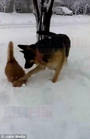 小貓Kiwi當時正在雪地裡小心翼翼地玩耍,而德國牧羊犬Katniss則很活潑。Katniss跑到Kiwi身邊想跟她一起玩耍,誰知高冷的Kiwi並不想理會,於是Katniss趁貓貓不注意用右掌將Kiwi臉摁進雪中後逃跑。