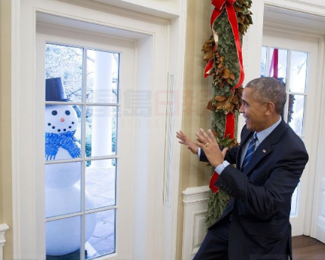 據巴士的報報道,美國總統奧巴馬將在白宮度過總統生涯最後一個聖誕節。白宮人員為了讓奧巴馬留下深刻回憶,故意在橢圓形辦公室窗外擺放一個看似在偷窺的雪人,想嚇奧巴馬一跳。