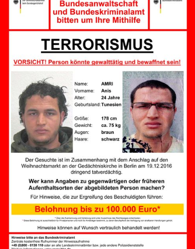 德國聯邦警察公開24歲特尼斯裔疑犯阿姆里(Anis Amri )的照片,指他擁有六個不同姓名及突尼斯、埃及和黎巴嫩三個國籍,指他可能有武器,是危險人物。消息指,警方在涉事貨車找到檢獲阿姆尼在德國的臨時居住證件,懷疑他可能與貨車司機搏鬥期間受傷。