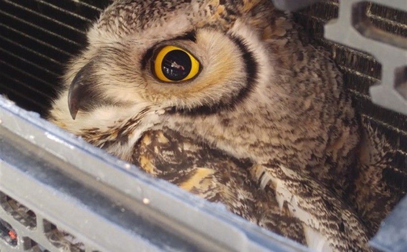 據加通社報道,一只巨角貓頭鷹(Great horned owl)在亞省高速公路上被一輛SUV撞到,卡進汽車的前面鐵網格里,這隻貓頭鷹竟沒有受傷。