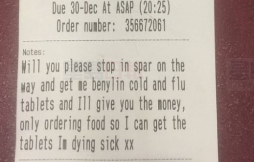 這位女性顧客在網上訂單的「附加言論」欄中說,「能不能在路上的雜貨店停一下給我買點感冒藥片,我給你錢。」