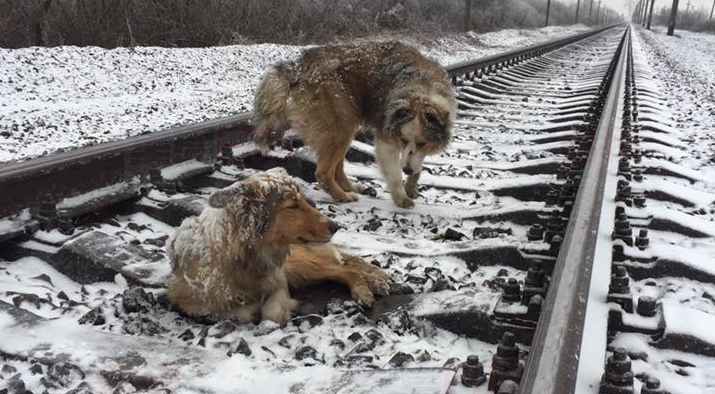 這段視頻由Denis Malafeev發佈在臉書上。聖誕節時,兩隻狗被看到臥在烏克蘭的一處鐵軌上。其中一只受傷了,不能站立,另一只狗在旁邊守著它。火車逼近后,公狗趴下來,把母狗的頭壓下來,保護她不被駛過的火車撞到。