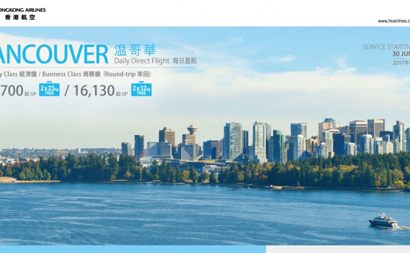 據香港航空:香港航空將由2017月6月30日起,正式開通每日一班來往香港至溫哥華國際機場的直航服務,並採用空中巴士A330客機營運。2017年適逢加拿大立國150周年,旅客可以低至HK$3,700*優惠票價暢遊楓葉國,感受慶典熱鬧氣氛。
