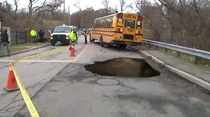 據CP24報道:多倫多西區Harwood 社區一條道路今早突然塌陷,差點將一輛行駛中的校巴吞沒。