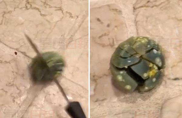 這枚色彩缤紛的雞蛋在9年前複活節的“尋找彩蛋”遊戲中被遺忘在沙發坐墊下,直至今天才被發現。在這段令人反胃的視頻中,在Reddit McReddit搖了搖雞蛋後,能聽到有東西在裏面翻滾,他說道“裏面已經變成一個皮球了。”繼而用刀敲開9歲的雞蛋殼,露出裏面一個奇形怪狀、腐爛的腫塊。