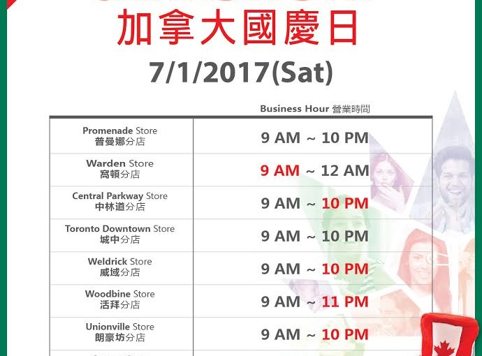 國慶日長週末多倫多的大統華均開門,只是營業時間不同,詳見上圖。