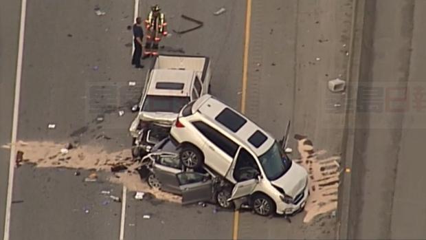 據視頻顯示,至少三部汽車,包括一部四驅車和一部開斗貨車,死傷者由直升機送院。