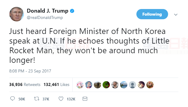 川普星期六在推特上說:“剛聽到北韓外交部長在聯合國講話,如果他想起小火箭人的想法,他們就不會再呆太久了!”