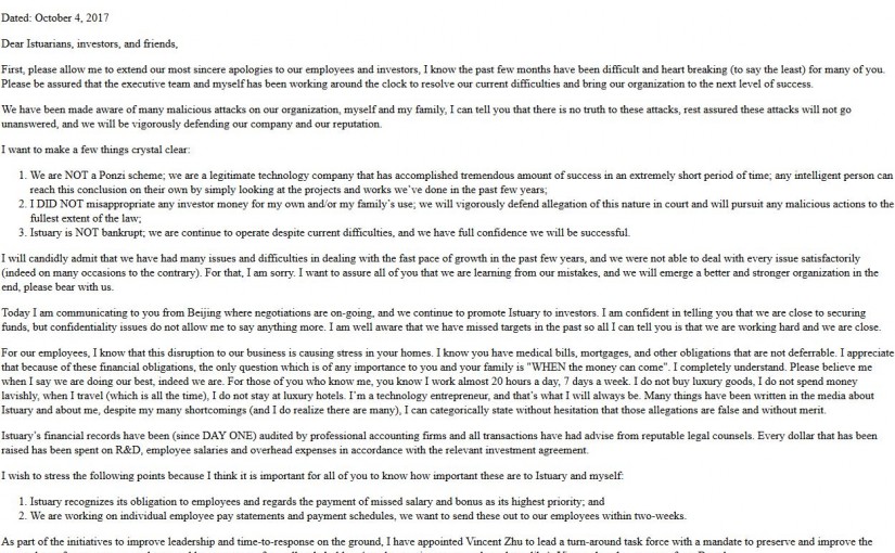 在溫哥華創立分公司的溢思得瑞科技創新集團(Istuary Innovation Group)日前被指以龐氏手法在本地行騙,涉款或超過400萬元。不過,該公司主事人孫一桉近日在公司網站用英文發表一封公開信稱,他的公司不是一個旁龐騙局計劃,即使現在面臨困難,他將繼續尋求新的資金。