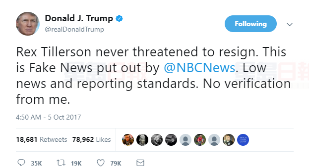 特朗普曾給有關蒂勒森辭職的新聞闢謠 圖片來源:Twitter