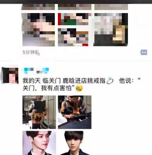 鹿晗剛剛公佈和關曉彤戀情,10月12日,有網友通過微博爆料,稱偶遇鹿晗在挑選戒指。網友稱鹿晗在臨關門前進店,還看到快要關門,調侃說:“關門,我有點害怕!”