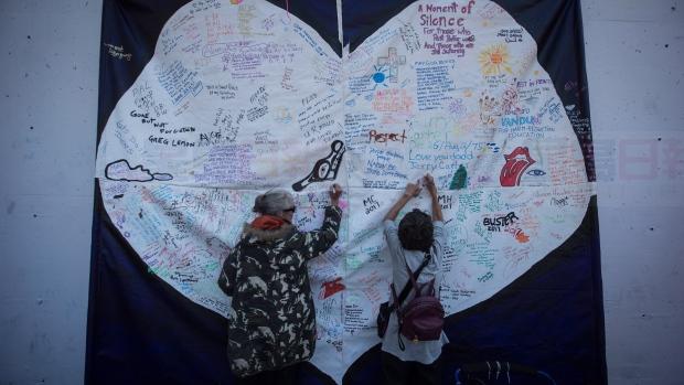 今年8月31日在溫市市中心東端,市民寫下悼念吸毒過量死者的字句。CBC電視圖片