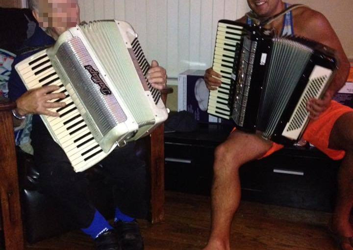 疑犯魯賓遜(右)與受害男長者一起彈奏手風琴。Global電視圖片