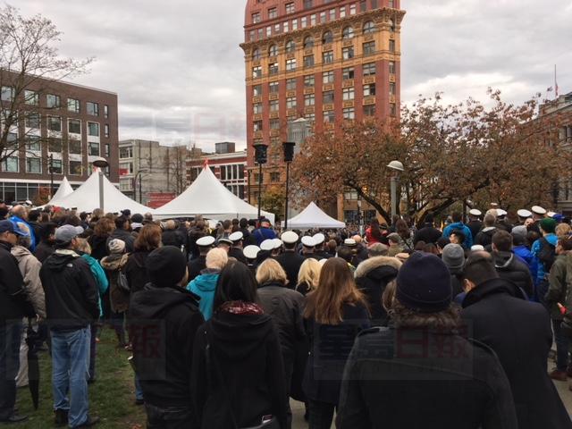 溫哥華的國殤日活動在周六早上10時展開,其中勝利廣場的獻花儀式,有大量市民出席,現場水洩不通。