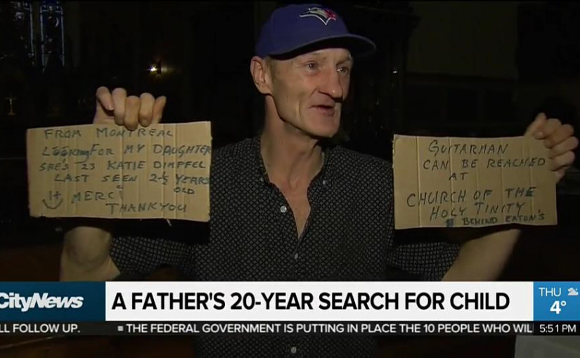 他隨身攜帶兩個紙板,其中一個表明她在尋找凱蒂,第二個是說可以在聖三一教堂找到他。