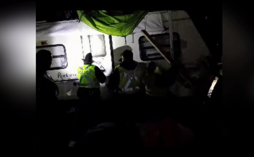 騎警發言人麥克唐納(Chuck McDonald)透露,兩個被捕原住民女子把一輛露營車,非法停泊在謝爾芒特街(Shellmount St.),阻擋通道,經過多次警誡無效後,警方於周三晚持搜查令,2人繼續拒絕離去,於是採取逮捕行動。